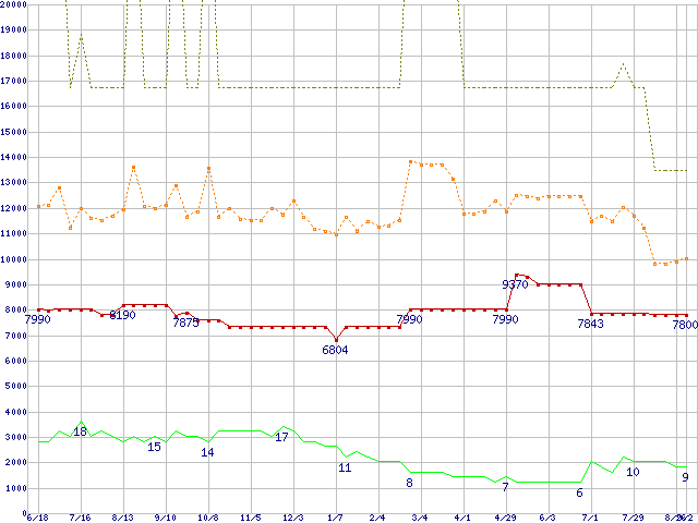 ※このグラフは過去のデータも税率5%相当に調整した税込み相当額のグラフです。 税率変更や、総額表示方式導入(2004年4月)の影響は除いています。 | | | ●凡例 | 最安値 (点線部は販売店未確認 または未調査) | 平均値 | 最高値 | ショップ数 |