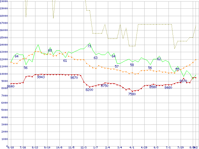 ※このグラフは過去のデータも税率5%相当に調整した税込み相当額のグラフです。 税率変更や、総額表示方式導入(2004年4月)の影響は除いています。 | | | ●凡例 | 最安値 (点線部は販売店未確認 または未調査) | 平均値 | 最高値 | ショップ数 |