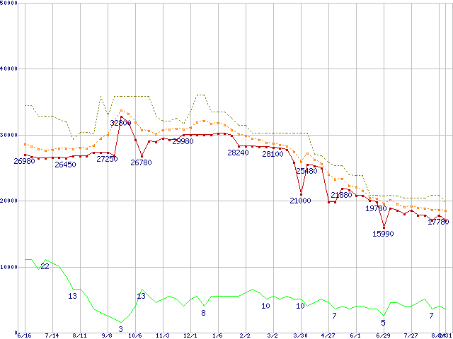 | HDS724040KLSA80 (400GB,8MB)の価格推移 | | | (2005年6月16日~2006年8月31日) |