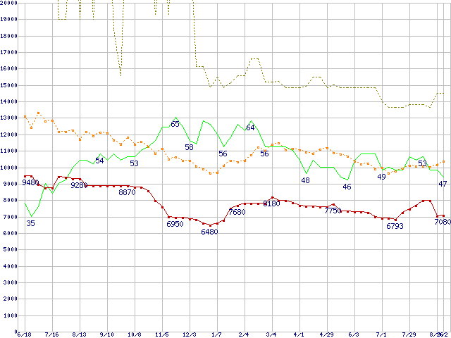 ※このグラフは過去のデータも税率5%相当に調整した税込み相当額のグラフです。 税率変更や、総額表示方式導入(2004年4月)の影響は除いています。 | | | ●凡例 | 最安値 (点線部は販売店未確認 または未調査) | 平均値 | 最高値 | ショップ数 |