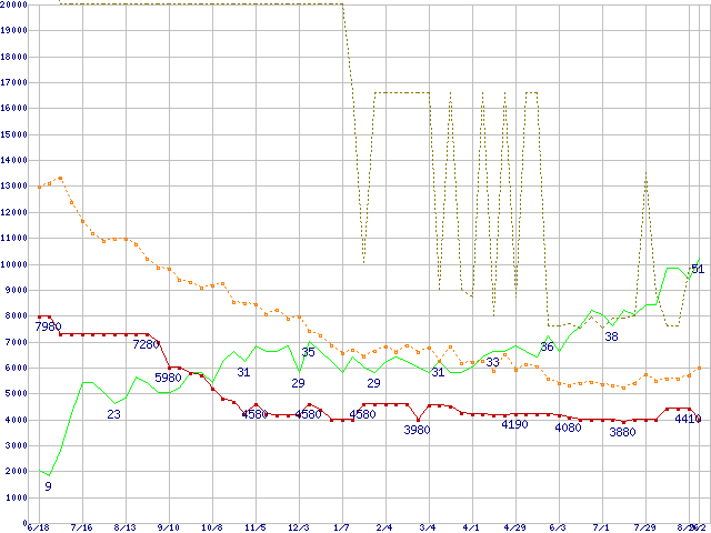 メモリ主要製品(最安値5千円未満)の最安値推移