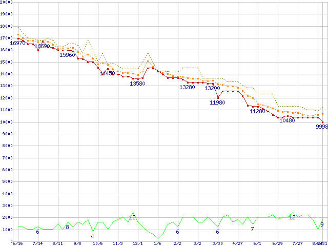 ※このグラフは過去のデータも税率5%相当に調整した税込み相当額のグラフです。 税率変更や、総額表示方式導入(2004年4月)の影響は除いています。 | | | ●凡例 | 最安値 (点線部は販売店未確認 または未調査) | 平均値 | 最高値 | ショップ数 |