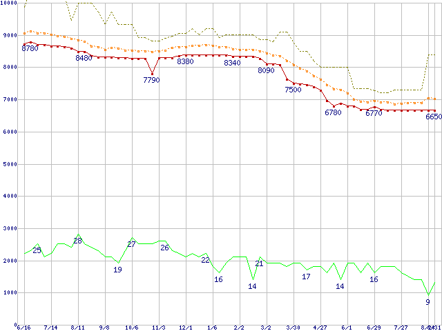 ※このグラフは過去のデータも税率5%相当に調整した税込み相当額のグラフです。 税率変更や、総額表示方式導入(2004年4月)の影響は除いています。 | | | ●凡例 | 最安値 (点線部は販売店未確認 または未調査) | 平均値 | 最高値 | ショップ数 |