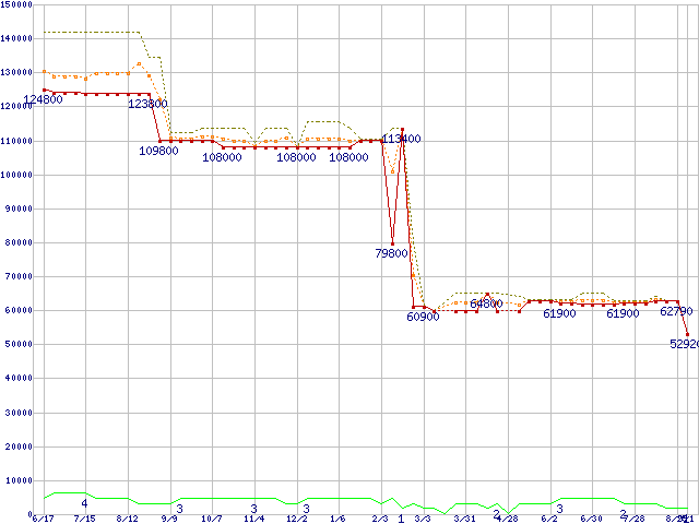 ※このグラフは過去のデータも税率5%相当に調整した税込み相当額のグラフです。 税率変更や、総額表示方式導入(2004年4月)の影響は除いています。 | | | ●凡例 | 最安値 (点線部は販売店未確認 または未調査) | 平均値 | 最高値 | ショップ数 |