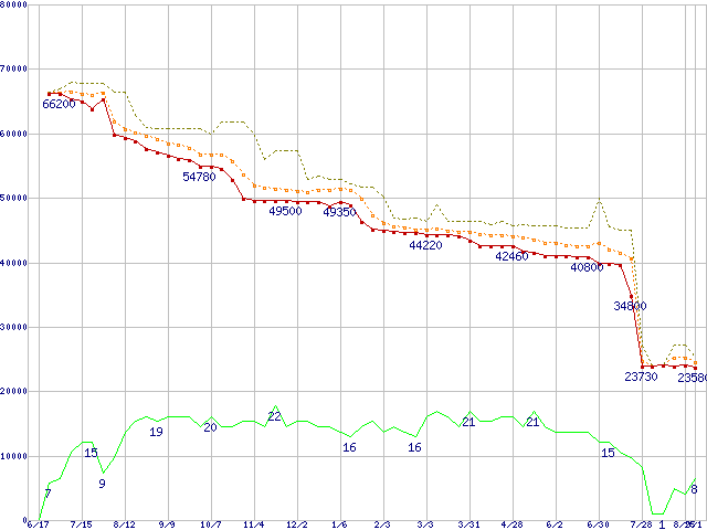 | Athlon 64 X2 4200+ (2.2GHz,L2 512KB×2,Socket 939)の価格推移 | | | (2005年6月17日~2006年9月1日) |
