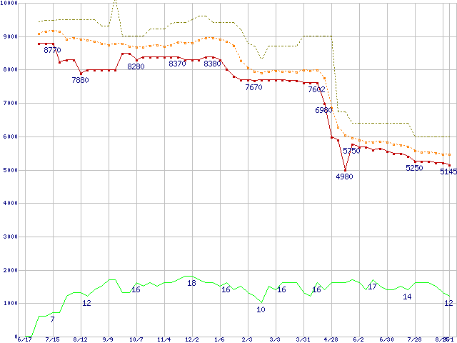 ※このグラフは過去のデータも税率5%相当に調整した税込み相当額のグラフです。 税率変更や、総額表示方式導入(2004年4月)の影響は除いています。 | | | ●凡例 | 最安値 (点線部は販売店未確認 または未調査) | 平均値 | 最高値 | ショップ数 |
