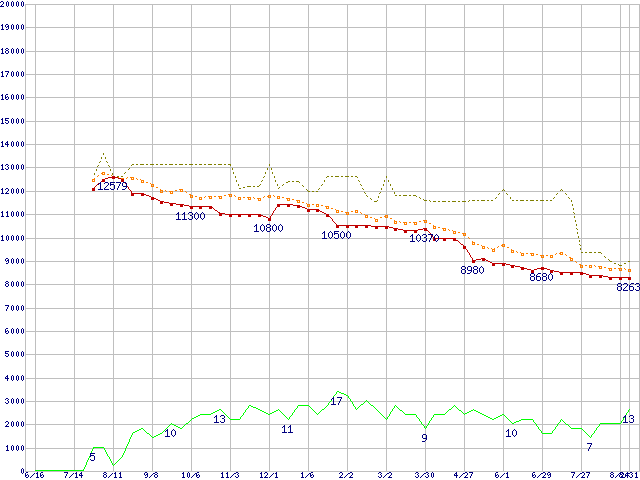 ※このグラフは過去のデータも税率5%相当に調整した税込み相当額のグラフです。 税率変更や、総額表示方式導入(2004年4月)の影響は除いています。 | | | ●凡例 | 最安値 (点線部は販売店未確認 または未調査) | 平均値 | 最高値 | ショップ数 |