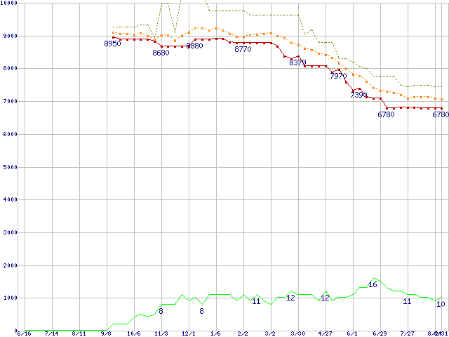 ※このグラフは過去のデータも税率5%相当に調整した税込み相当額のグラフです。 税率変更や、総額表示方式導入(2004年4月)の影響は除いています。 | | | ●凡例 | 最安値 (点線部は販売店未確認 または未調査) | 平均値 | 最高値 | ショップ数 |