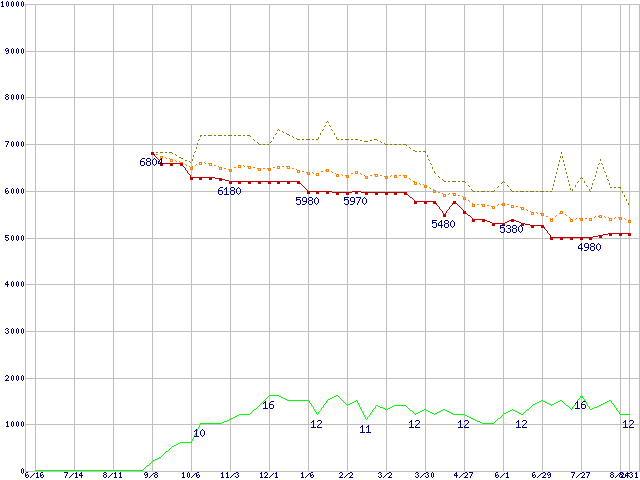 ※このグラフは過去のデータも税率5%相当に調整した税込み相当額のグラフです。 税率変更や、総額表示方式導入(2004年4月)の影響は除いています。 | | | ●凡例 | 最安値 (点線部は販売店未確認 または未調査) | 平均値 | 最高値 | ショップ数 |