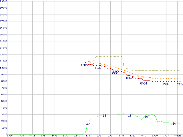 ※このグラフは過去のデータも税率5%相当に調整した税込み相当額のグラフです。 税率変更や、総額表示方式導入(2004年4月)の影響は除いています。 | | | ●凡例 | 最安値 (点線部は販売店未確認 または未調査) | 平均値 | 最高値 | ショップ数 |