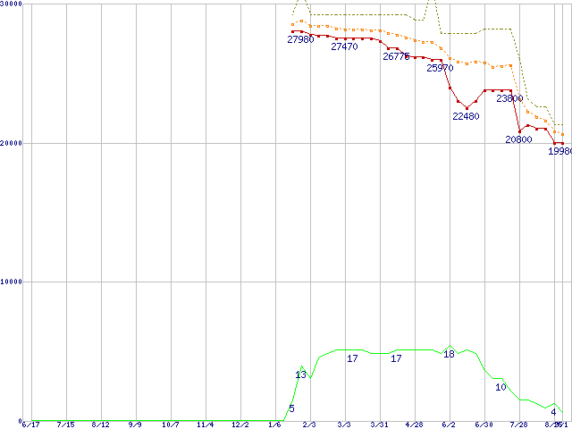 ※このグラフは過去のデータも税率5%相当に調整した税込み相当額のグラフです。 税率変更や、総額表示方式導入(2004年4月)の影響は除いています。 | | | ●凡例 | 最安値 (点線部は販売店未確認 または未調査) | 平均値 | 最高値 | ショップ数 |