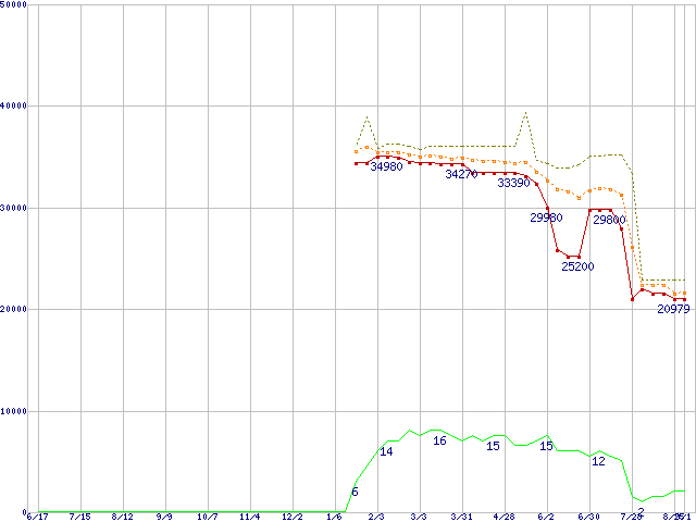 ※このグラフは過去のデータも税率5%相当に調整した税込み相当額のグラフです。 税率変更や、総額表示方式導入(2004年4月)の影響は除いています。 | | | ●凡例 | 最安値 (点線部は販売店未確認 または未調査) | 平均値 | 最高値 | ショップ数 |