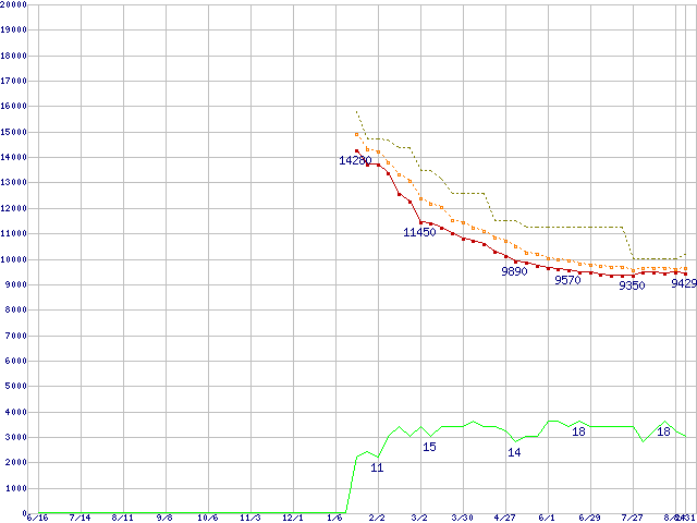 ※このグラフは過去のデータも税率5%相当に調整した税込み相当額のグラフです。 税率変更や、総額表示方式導入(2004年4月)の影響は除いています。 | | | ●凡例 | 最安値 (点線部は販売店未確認 または未調査) | 平均値 | 最高値 | ショップ数 |