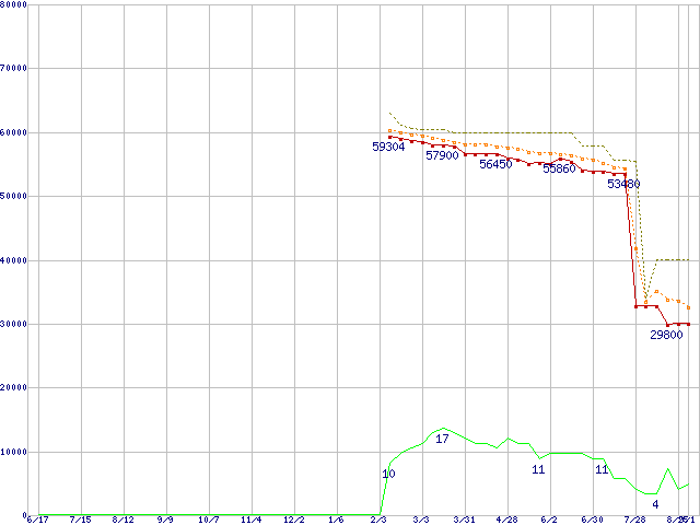※このグラフは過去のデータも税率5%相当に調整した税込み相当額のグラフです。 税率変更や、総額表示方式導入(2004年4月)の影響は除いています。 | | | ●凡例 | 最安値 (点線部は販売店未確認 または未調査) | 平均値 | 最高値 | ショップ数 |