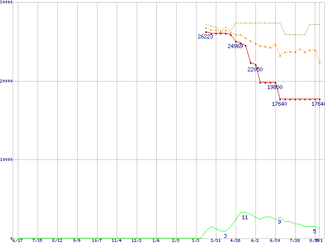 ※このグラフは過去のデータも税率5%相当に調整した税込み相当額のグラフです。 税率変更や、総額表示方式導入(2004年4月)の影響は除いています。 | | | ●凡例 | 最安値 (点線部は販売店未確認 または未調査) | 平均値 | 最高値 | ショップ数 |
