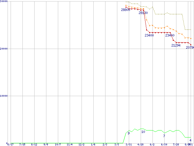 ※このグラフは過去のデータも税率5%相当に調整した税込み相当額のグラフです。 税率変更や、総額表示方式導入(2004年4月)の影響は除いています。 | | | ●凡例 | 最安値 (点線部は販売店未確認 または未調査) | 平均値 | 最高値 | ショップ数 |