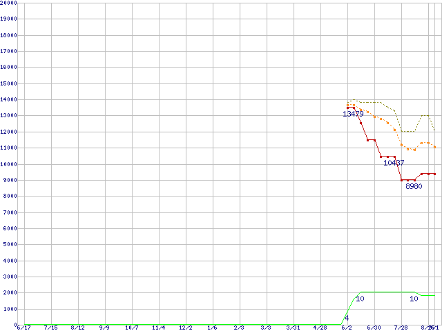※このグラフは過去のデータも税率5%相当に調整した税込み相当額のグラフです。 税率変更や、総額表示方式導入(2004年4月)の影響は除いています。 | | | ●凡例 | 最安値 (点線部は販売店未確認 または未調査) | 平均値 | 最高値 | ショップ数 |