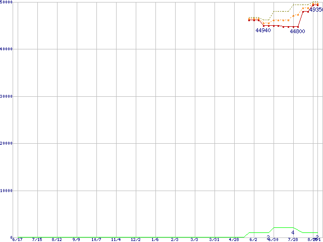 ※このグラフは過去のデータも税率5%相当に調整した税込み相当額のグラフです。 税率変更や、総額表示方式導入(2004年4月)の影響は除いています。 | | | ●凡例 | 最安値 (点線部は販売店未確認 または未調査) | 平均値 | 最高値 | ショップ数 |