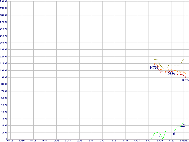 ※このグラフは過去のデータも税率5%相当に調整した税込み相当額のグラフです。 税率変更や、総額表示方式導入(2004年4月)の影響は除いています。 | | | ●凡例 | 最安値 (点線部は販売店未確認 または未調査) | 平均値 | 最高値 | ショップ数 |