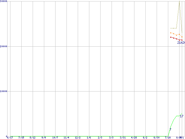 ※このグラフは過去のデータも税率5%相当に調整した税込み相当額のグラフです。 税率変更や、総額表示方式導入(2004年4月)の影響は除いています。 | | | ●凡例 | 最安値 (点線部は販売店未確認 または未調査) | 平均値 | 最高値 | ショップ数 |