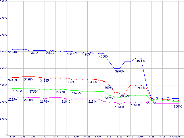 | LGA 775 (FSB 800MHz,L2 2MB,Hyper-Threading,EM64T対応)の最安値推移 | | | (2006年1月20日~2006年9月1日) |