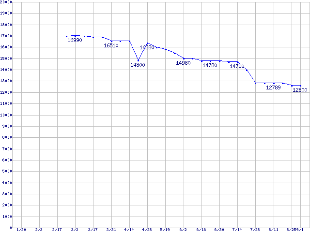| LGA 775 (FSB 533MHz,L2 1MB×2,Dual Core,EM64T対応)の最安値推移 | | | (2006年1月20日~2006年9月1日) |