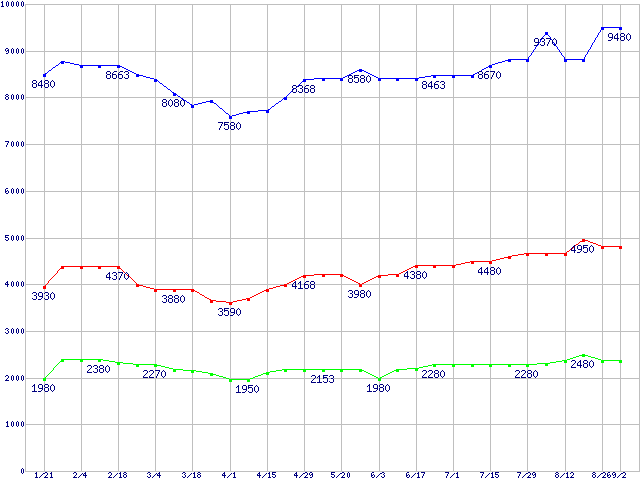 PC2-6400(DDR2-800) DDR2 SDRAM DIMMの最安値推移