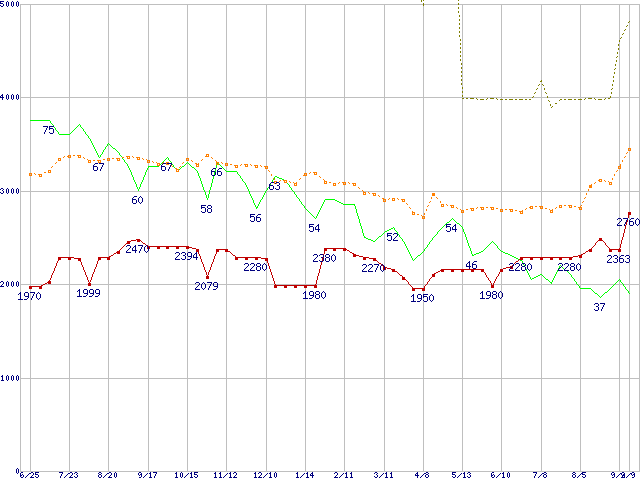 ※このグラフは過去のデータも税率5%相当に調整した税込み相当額のグラフです。 税率変更や、総額表示方式導入(2004年4月)の影響は除いています。 | | | ●凡例 | 最安値 (点線部は販売店未確認 または未調査) | 平均値 | 最高値 | ショップ数 |