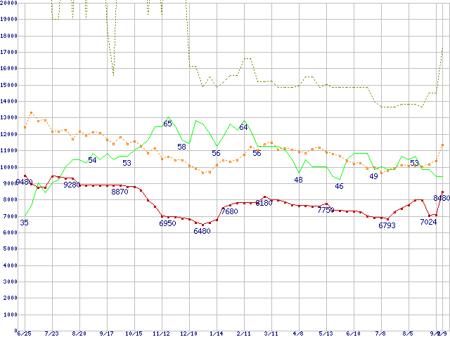 ※このグラフは過去のデータも税率5%相当に調整した税込み相当額のグラフです。 税率変更や、総額表示方式導入(2004年4月)の影響は除いています。 | | | ●凡例 | 最安値 (点線部は販売店未確認 または未調査) | 平均値 | 最高値 | ショップ数 |