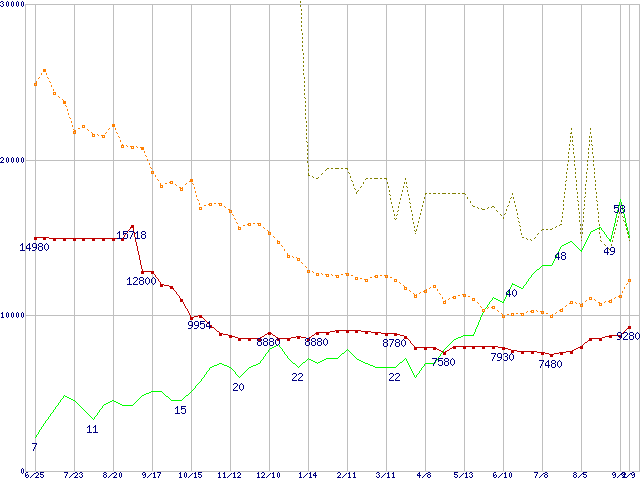 ※このグラフは過去のデータも税率5%相当に調整した税込み相当額のグラフです。 税率変更や、総額表示方式導入(2004年4月)の影響は除いています。 | | | ●凡例 | 最安値 (点線部は販売店未確認 または未調査) | 平均値 | 最高値 | ショップ数 |