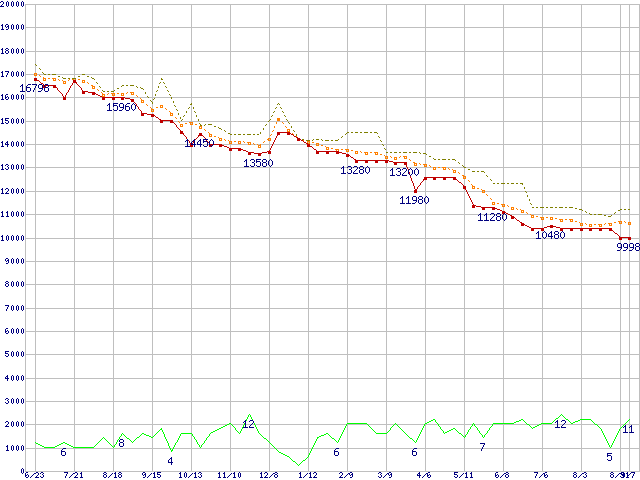 ※このグラフは過去のデータも税率5%相当に調整した税込み相当額のグラフです。 税率変更や、総額表示方式導入(2004年4月)の影響は除いています。 | | | ●凡例 | 最安値 (点線部は販売店未確認 または未調査) | 平均値 | 最高値 | ショップ数 |