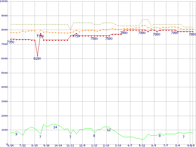 ※このグラフは過去のデータも税率5%相当に調整した税込み相当額のグラフです。 税率変更や、総額表示方式導入(2004年4月)の影響は除いています。 | | | ●凡例 | 最安値 (点線部は販売店未確認 または未調査) | 平均値 | 最高値 | ショップ数 |