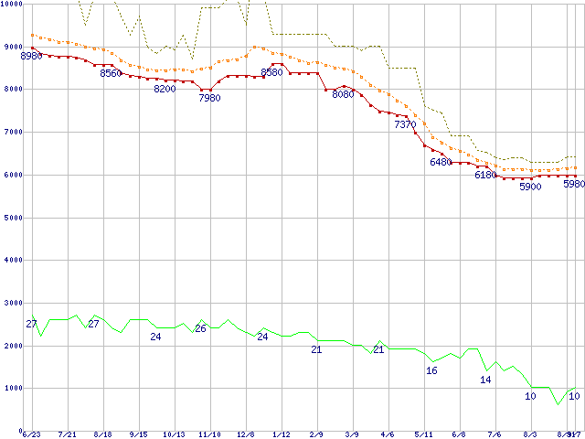 ※このグラフは過去のデータも税率5%相当に調整した税込み相当額のグラフです。 税率変更や、総額表示方式導入(2004年4月)の影響は除いています。 | | | ●凡例 | 最安値 (点線部は販売店未確認 または未調査) | 平均値 | 最高値 | ショップ数 |