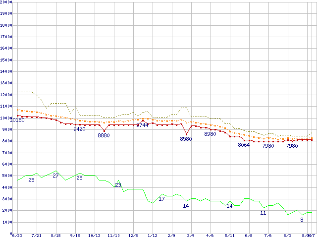 ※このグラフは過去のデータも税率5%相当に調整した税込み相当額のグラフです。 税率変更や、総額表示方式導入(2004年4月)の影響は除いています。 | | | ●凡例 | 最安値 (点線部は販売店未確認 または未調査) | 平均値 | 最高値 | ショップ数 |