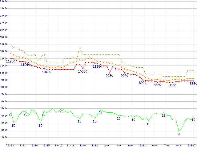 ※このグラフは過去のデータも税率5%相当に調整した税込み相当額のグラフです。 税率変更や、総額表示方式導入(2004年4月)の影響は除いています。 | | | ●凡例 | 最安値 (点線部は販売店未確認 または未調査) | 平均値 | 最高値 | ショップ数 |