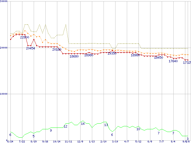 ※このグラフは過去のデータも税率5%相当に調整した税込み相当額のグラフです。 税率変更や、総額表示方式導入(2004年4月)の影響は除いています。 | | | ●凡例 | 最安値 (点線部は販売店未確認 または未調査) | 平均値 | 最高値 | ショップ数 |
