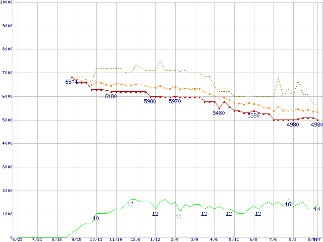 ※このグラフは過去のデータも税率5%相当に調整した税込み相当額のグラフです。 税率変更や、総額表示方式導入(2004年4月)の影響は除いています。 | | | ●凡例 | 最安値 (点線部は販売店未確認 または未調査) | 平均値 | 最高値 | ショップ数 |