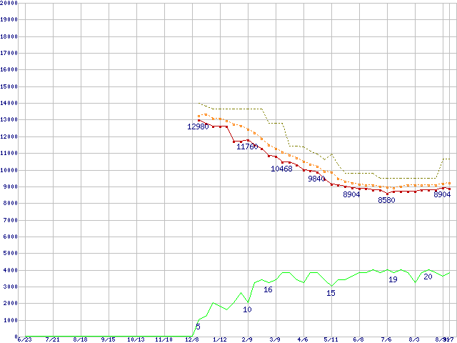 ※このグラフは過去のデータも税率5%相当に調整した税込み相当額のグラフです。 税率変更や、総額表示方式導入(2004年4月)の影響は除いています。 | | | ●凡例 | 最安値 (点線部は販売店未確認 または未調査) | 平均値 | 最高値 | ショップ数 |