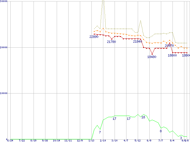 ※このグラフは過去のデータも税率5%相当に調整した税込み相当額のグラフです。 税率変更や、総額表示方式導入(2004年4月)の影響は除いています。 | | | ●凡例 | 最安値 (点線部は販売店未確認 または未調査) | 平均値 | 最高値 | ショップ数 |
