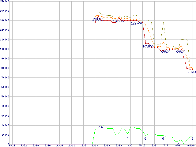 ※このグラフは過去のデータも税率5%相当に調整した税込み相当額のグラフです。 税率変更や、総額表示方式導入(2004年4月)の影響は除いています。 | | | ●凡例 | 最安値 (点線部は販売店未確認 または未調査) | 平均値 | 最高値 | ショップ数 |