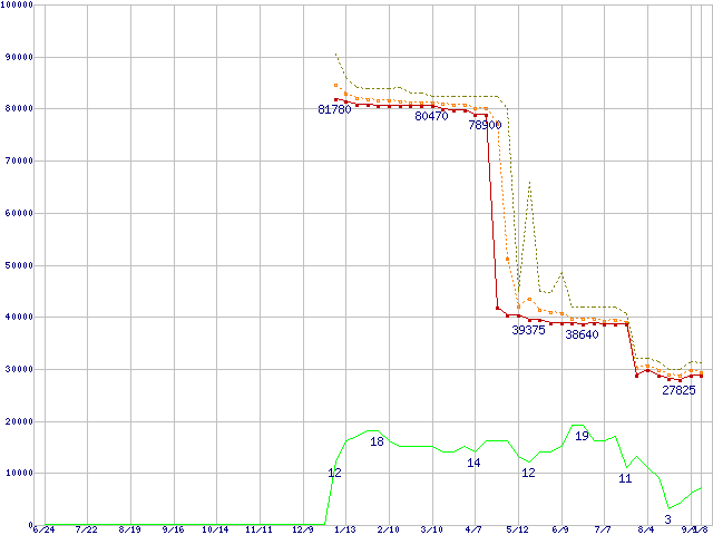 ※このグラフは過去のデータも税率5%相当に調整した税込み相当額のグラフです。 税率変更や、総額表示方式導入(2004年4月)の影響は除いています。 | | | ●凡例 | 最安値 (点線部は販売店未確認 または未調査) | 平均値 | 最高値 | ショップ数 |