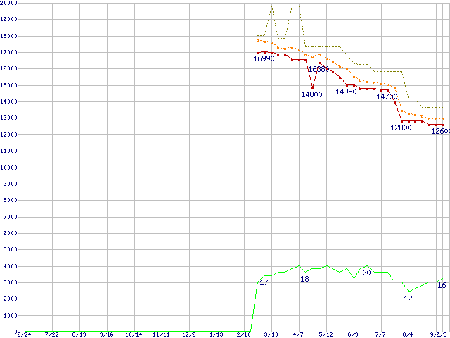 ※このグラフは過去のデータも税率5%相当に調整した税込み相当額のグラフです。 税率変更や、総額表示方式導入(2004年4月)の影響は除いています。 | | | ●凡例 | 最安値 (点線部は販売店未確認 または未調査) | 平均値 | 最高値 | ショップ数 |