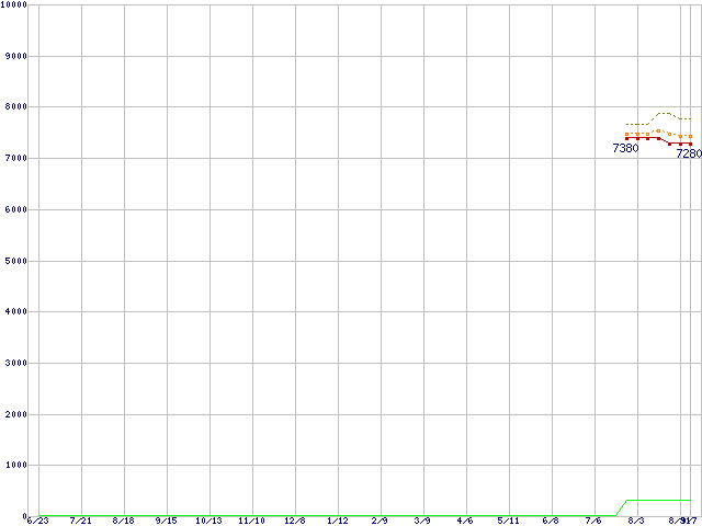 ※このグラフは過去のデータも税率5%相当に調整した税込み相当額のグラフです。 税率変更や、総額表示方式導入(2004年4月)の影響は除いています。 | | | ●凡例 | 最安値 (点線部は販売店未確認 または未調査) | 平均値 | 最高値 | ショップ数 |
