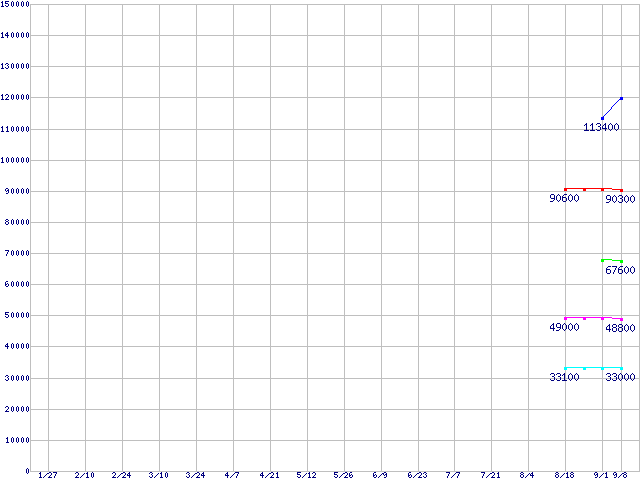 | Socket F (FSB 1000MHz,L2 1MBx2,Dual Core,TDP 95W)の最安値推移 | | | (2006年1月27日~2006年9月8日) |
