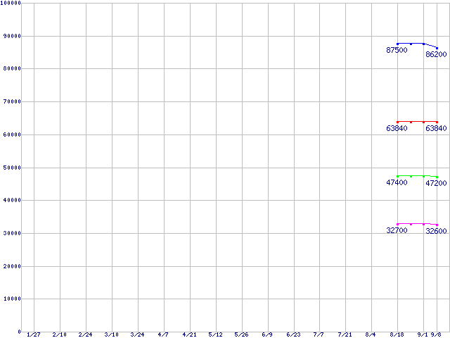 | Socket AM2 (FSB 1000MHz,L2 1MBx2,Dual Core,TDP 103W)の最安値推移 | | | (2006年1月27日~2006年9月8日) |