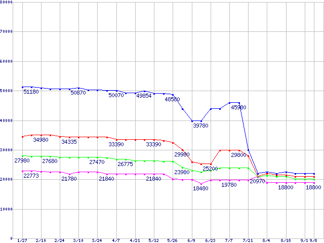 | LGA 775 (FSB 800MHz,L2 2MB,Hyper-Threading,EM64T対応)の最安値推移 | | | (2006年1月27日~2006年9月8日) |