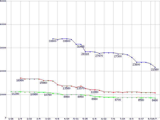| WD Caviar SE16 (7200rpm,Serial ATA II/3Gbps,16MB)の最安値推移 | | | (2006年1月26日~2006年9月7日) |