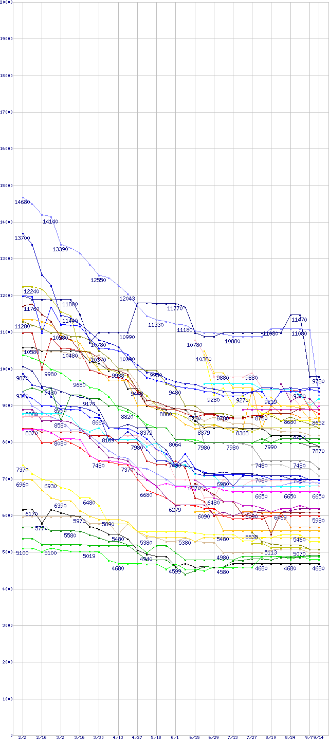 | HDD主要製品(最安値1万円未満)の最安値推移 | | | (2006年2月2日~2006年9月14日) |