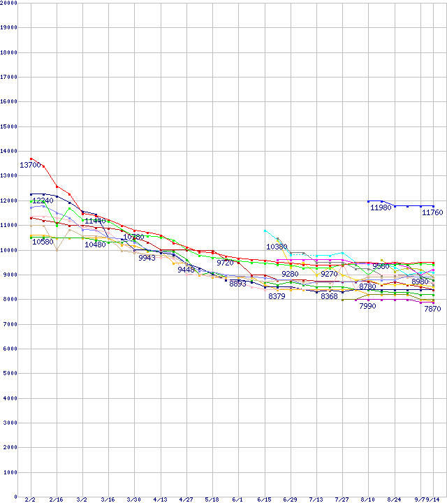 | HDD 250~300GB未満の最安値推移 | | | (2006年2月2日~2006年9月14日) |