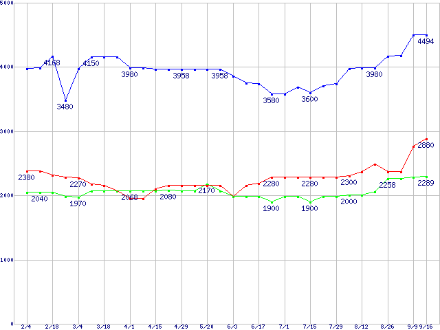 メモリ主要製品(最安値5千円未満)の最安値推移